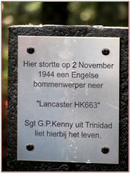 Maar er stond haar nog een verrassing te wachten. De wandeling werd aan de andere kant van de afrastering buiten de begraafplaats voortgezet. Daar werd halt gehouden bij een paal die aan de bovenkant was afgedekt met een doek. Joop Hendrix richtte het woord tot een niets vermoedende Margie Lumsden. Hij nodigde haar uit samen met hem het doekje te verwijderen, waarmee een gedenkplaatje onthuld werd ter herinnering aan de crash en ter nagedachtenis aan de gesneuvelde Sergeant Gerald Patrick Kenny.