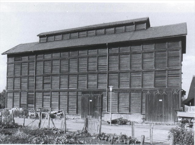 Der im Herbst gebrochene, grüne Tabak wurde zu Hause, meist im Hof oder in der Scheuer, gewöhnlich von Frauen auf eine Schnur aufgefädelt und zum Trocknen aufgehängt; das geschah bis 1943 auf dem Hof unter Dachvorsprüngen, in Scheune, Schuppen und Speicher. Während des Krieges, in den Jahren 1941 bis 1943, hat der Tabakbauverein den aus Richtung Sprantal gut sichtbaren Tabaktrockenschuppen erbaut. …..“