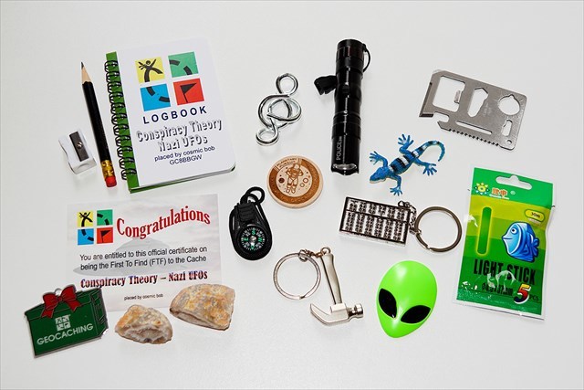 Natürlich wirst du in meinem Cache - den alten Gepflogenheiten entsprechend - neben dem Logbuch auch Trade-Items unterschiedlicher Art vorfinden (siehe Foto). Ich würde mich freuen, wenn auch wirklich getauscht und nicht nur entnommen wird. Für den Erstfinder gibt es eine Urkunde sowie eine Druse und einen Travel Tag (natürlich unregistriert).