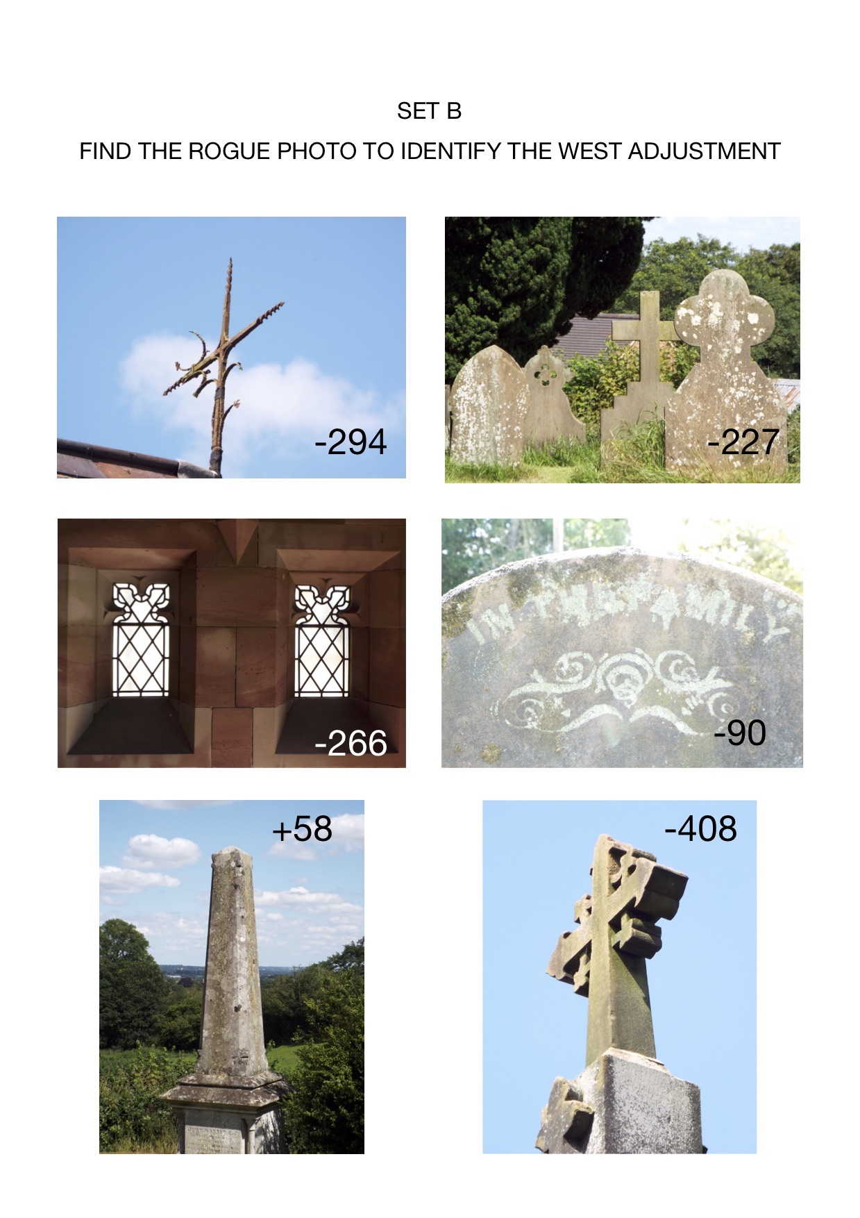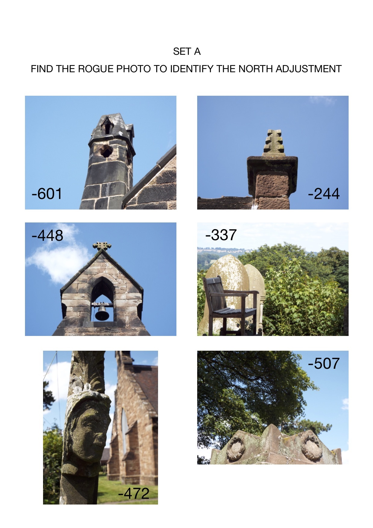 To complete this cache you will need to walk around the church identifying the 10 photos which apply to this Church and the two which don't. There is a red herring in each of the sets A and B and this rogue has the three digit adjustment (note its a "+" or a "-") which you need to complete the North (set A) and West (set B)
