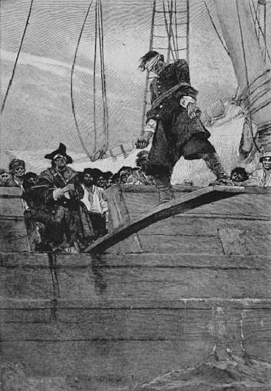 Walking the plank was a form of murder or torture thought to have been practiced by pirates, mutineers and other rogue seafarers. The victim was forced to walk off the end of a wooden plank or beam extended over the side of a ship, falling into the water to drown, sometimes with bound hands or weighed down, often into the vicinity of sharks (which would often follow ships).