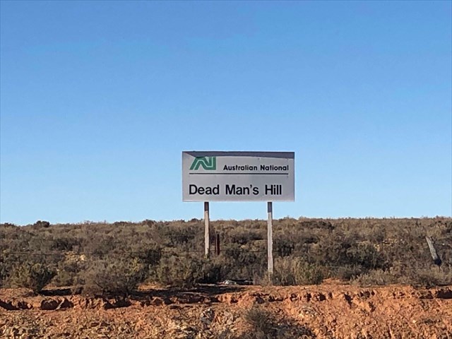 Between Peterborough and Broken Hill there is an old Australian National (AN) sign saying Dead Man’s Hill. Nearby there is a white wooden cross on the hill.