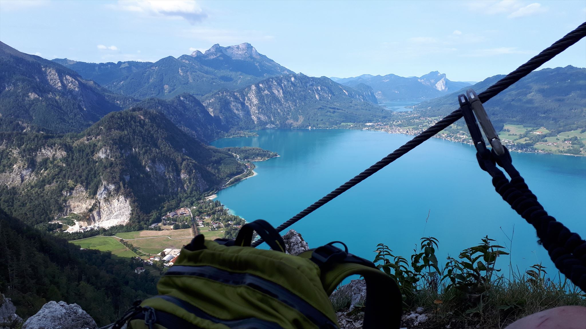 Wonderful and long Via Ferrata (Difficulty D) with fantastic views of the turquoise blue Attersee and the darker Mondsee. Find the English text at the end.
