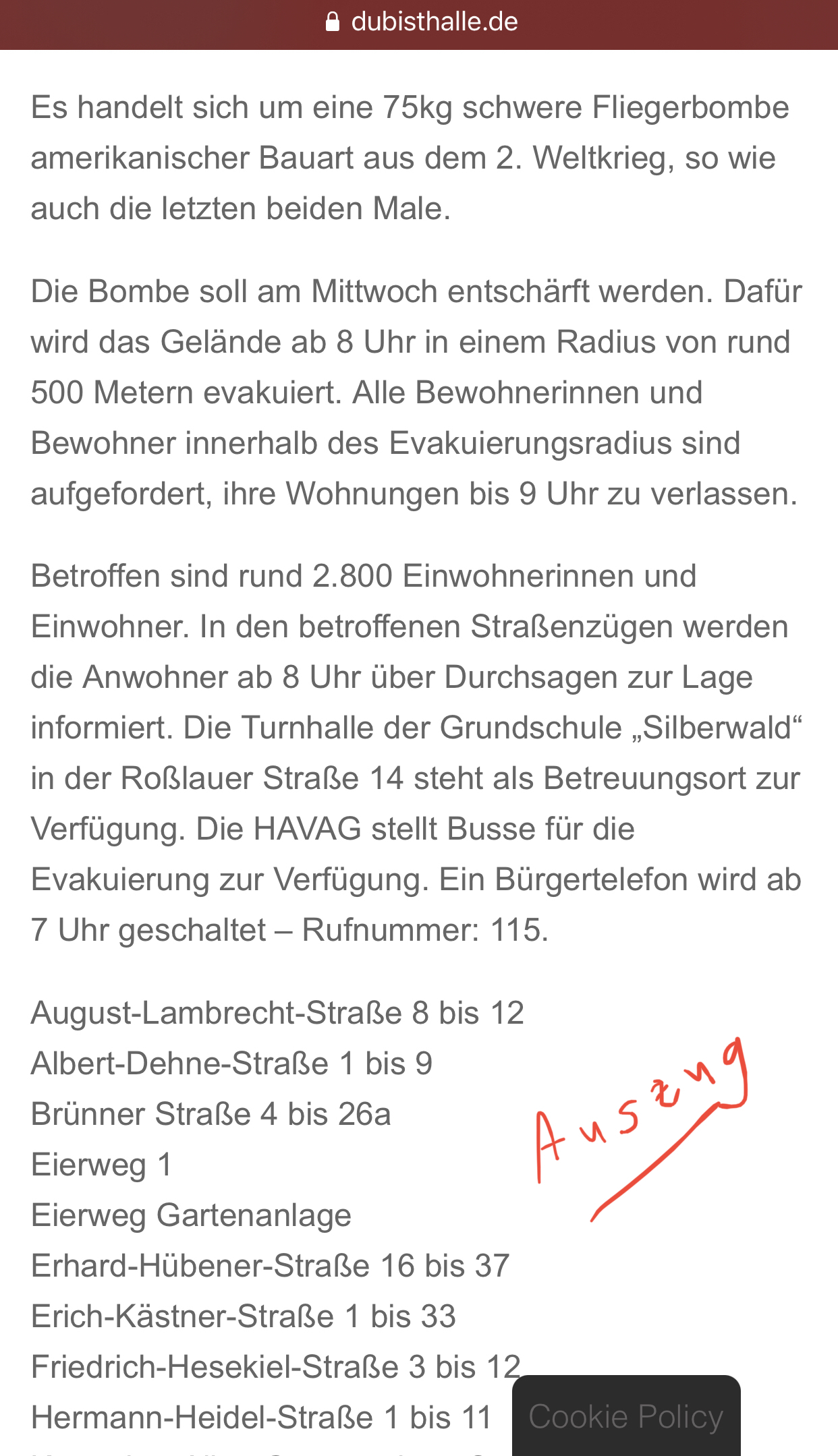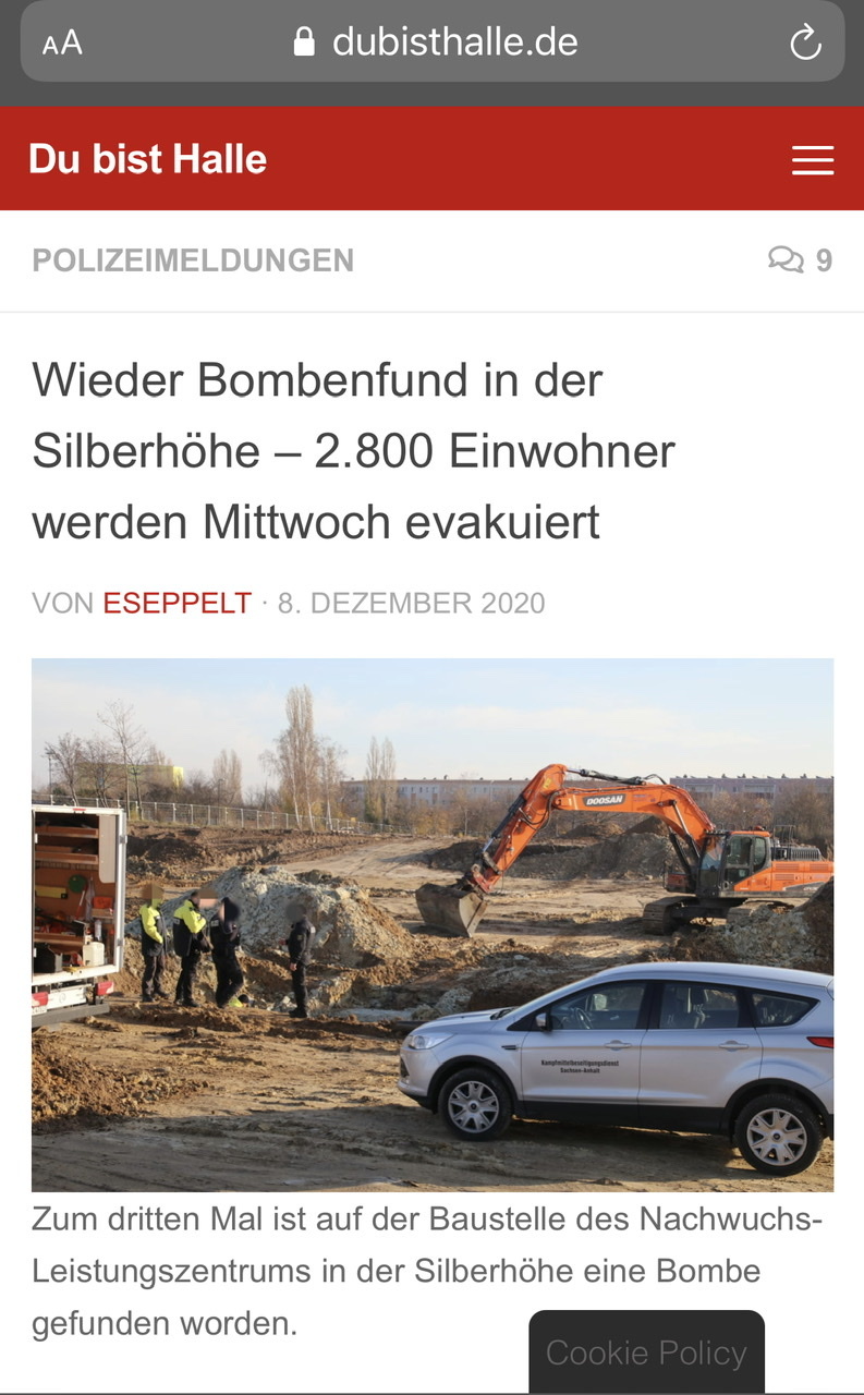 Auszug aus https://dubisthalle.de/wieder-bombenfund-in-der-silberhoehe1, heute abgerufen, als Bildschirmabdrucke.