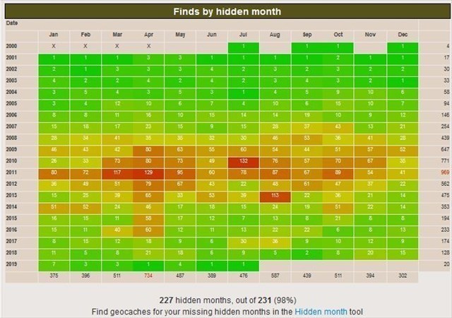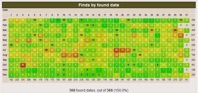 - 366-Tage-Versteckdatum-Matrix: die Matrix "Finds by Hidden Date" ist mit mindestens einem Fund pro Feld gefüllt.