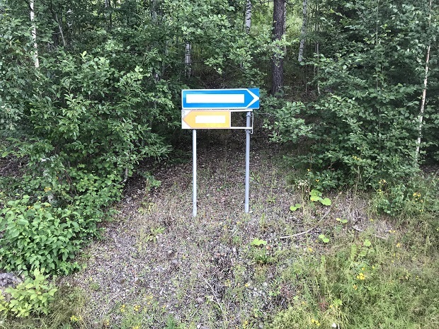 På platsen för koordinaterna finns det en blå och en gul vägskylt.