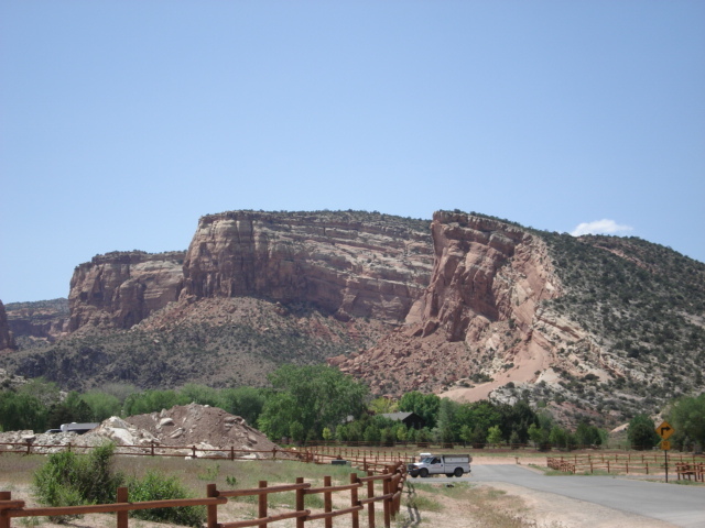 #1) Estimate the height of the vertical face of the cliffs above the tree line. Given the distance away from you, it may be easier to use a referent size and then estimate how many of the referent. For example, I estimated the nearest trees to be about 25 feet tall, and then estimated the height of the vertical face in 'trees', and multiplied to find the height of the vertical face.