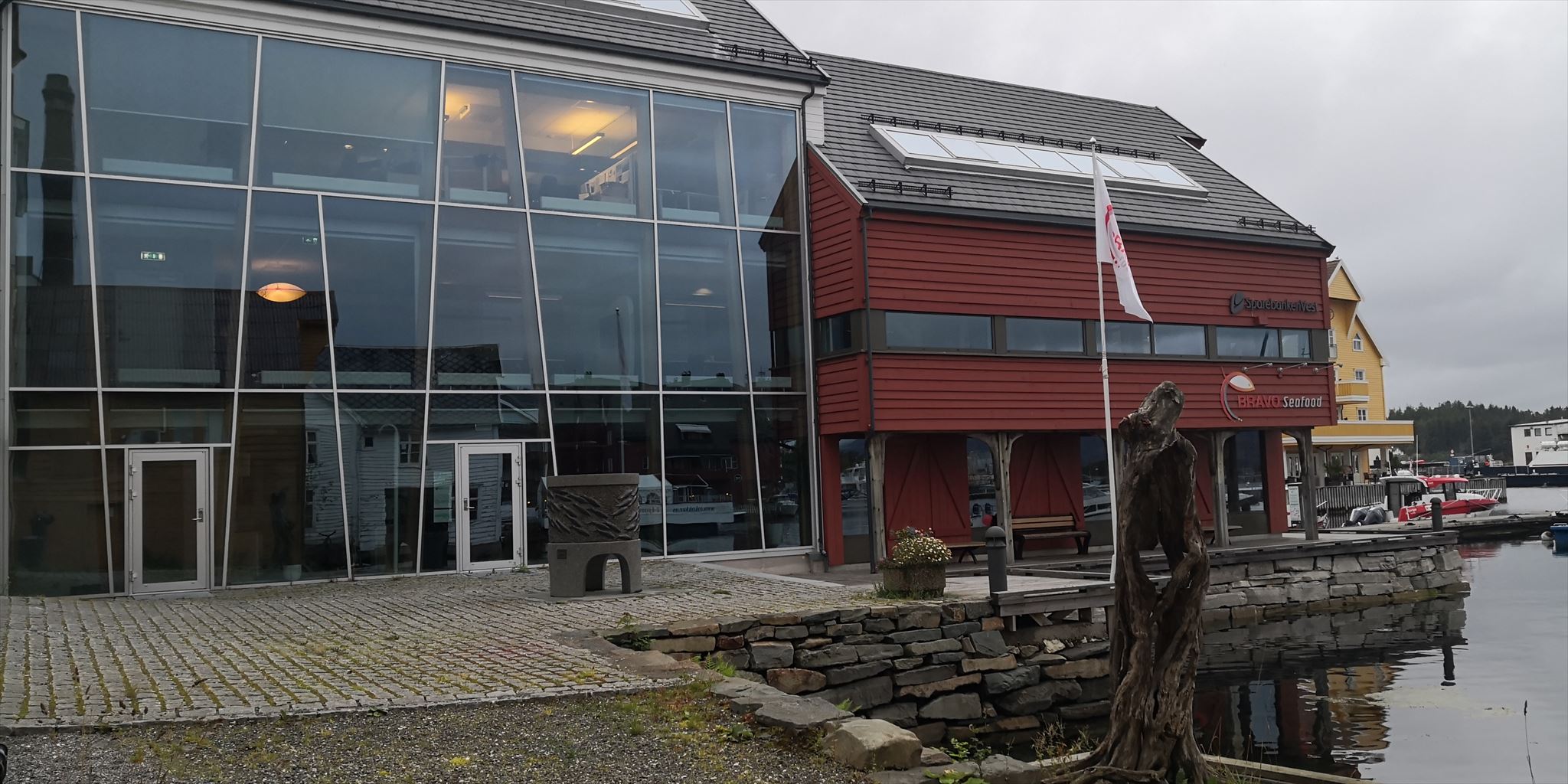 In the transition between the guestharbour and main street in Florø, Strandgata, the sculpture " Sild i stim" - "Herring in shoals" is placed. Created by Hjalmar Lothe, and unveiled on June 21, 2013. Right next to it is Horne Brygge, a project that preserved two old buildings and merged them as a functional, new building. The old house in front was dismantled and rehabilitated in the construction process, and moved forward several meters towards the sea. The glass building was made as a link to Hornehuset in the main street.