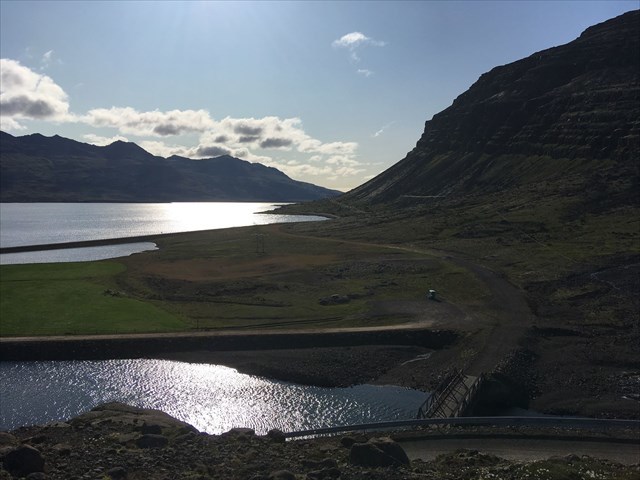 Fossárdalur (Waterfall - river - valley) lies above Fóssarvik bay and is about 20 km long. Tall cliffs named Klif tower above the bay and hide the valley from those travelling along the highway.