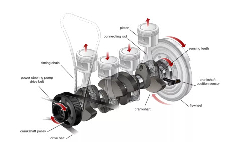 A failure in the crankshaft or piston connecting rods typically produces loud knocking or banging sounds from the engine and represents expensive repairs in the form of an engine rebuild or replacement.