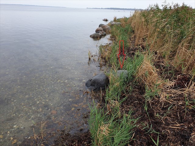 De to sten helt tæt på, hvor rødspættestenen er markeret med en rød pil. Bemærk det er højvandet, men man kan godt gå i sivkanten. UK: The two stones close up with the rødspættesten indicated. Note it is high tide when the picture was taken. It is possible to walk at the edge of the reed.