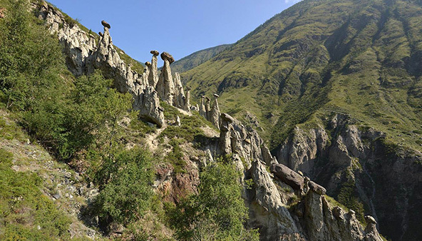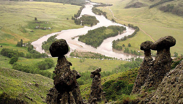 Welcome to the geological series AGT. The tract of Akkurum (Ak-Korum) is located on the right bank of the Chulyshman River, about 15 km from its confluence with Lake Teletskoye, in the Ulagan district of the Altai Republic. Akkurum, meaning “white rockslide”, is a very picturesque place which main attraction is the group of so-called “stone mushrooms” – stone pillars formed as a result of wind and water erosion and reaching a height of 7 meters.