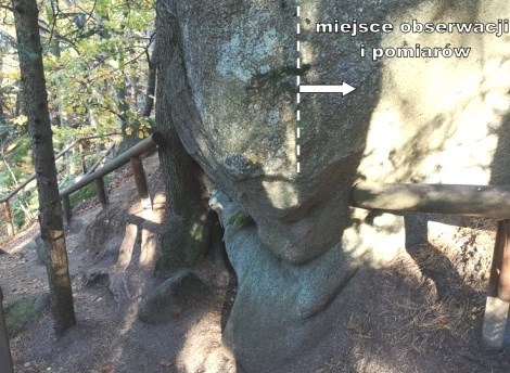 W pobliżu punktu WP3 (N 49° 36' 8.201'', E 21° 22' 3.399'') odszukaj miejsce ze zdjęcia, gdzie między barierki ścieżki wcina sie skała i drzewo. Spójrz na ścianę wyeksponowaną na wschód (od przerywanej linii w prawo) i odpowiedz na pytania: