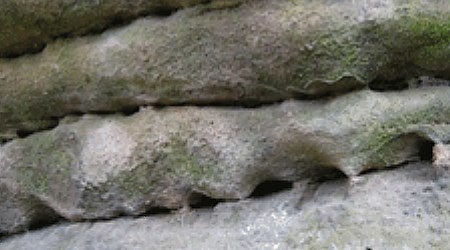 2. Formy arkadowe. Są to formy niszowate, ku górze sklepione łukowato w kształcie arkad, z czym kojarzy się ich zaproponowana nazwa. Występują one wzdłuż granic ławic, warstw lub poszczególnych lamin a nawet płaszczyzn spękań i ciągną się łańcuchowo, stąd także używana ich nazwa - struktury wrzecionowate lub koronkowe. Różnej wielkości zagłębienia, najczęściej kilka do kilkunastu centymetrów, są rozdzielone żeberkami lub kolumienkami, zbudowanymi z piaskowca o twardszym spoiwie. Pochodzenie tych form wietrzenia jest uwarunkowane krążeniem wód w skale, wzmożonym ich przesiąkaniem oraz erodowaniem piaskowca wzdłuż granic jego nieciągłości (np. spękań). Ewolucja struktur arkadowych polega na ich cofaniu się w głąb skały dzięki tworzeniu się na dalszym planie mniejszych, kolejnych arkad.