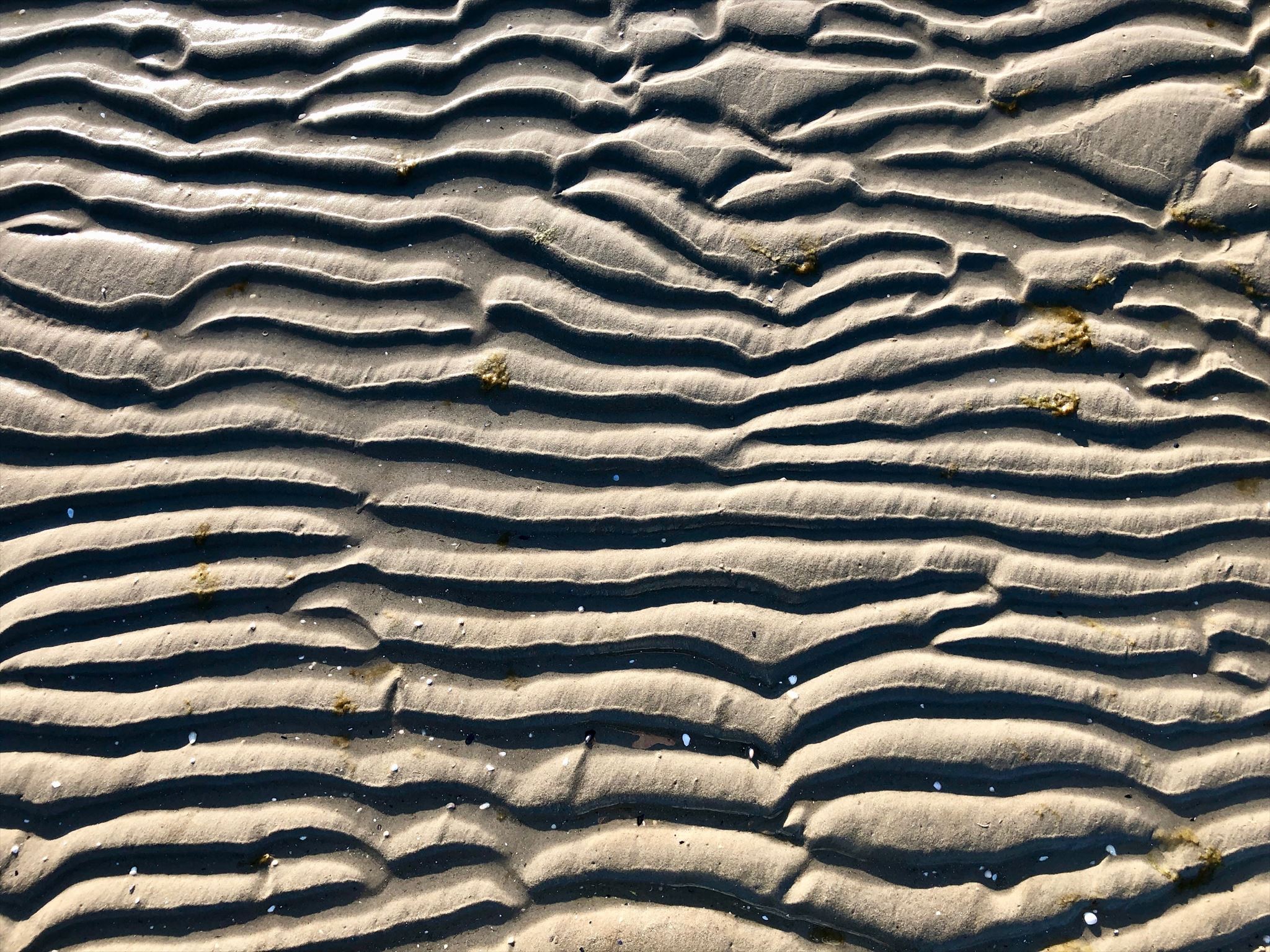 Rippel, dies sind schräggeschichtete Oberflächenformen und zählen zu den Sedimentstrukturen. Rippelmarken können zur Bestimmung der ursprünglichen Lagerung des Sediments dienen. Hier am Strand kann man zu fast jeder Zeit die beiden unterschiedlichen Formen von Rippelmarken erkennen. Man unterscheidet zwischen Strömungsrippel und Oszillationsrippel.