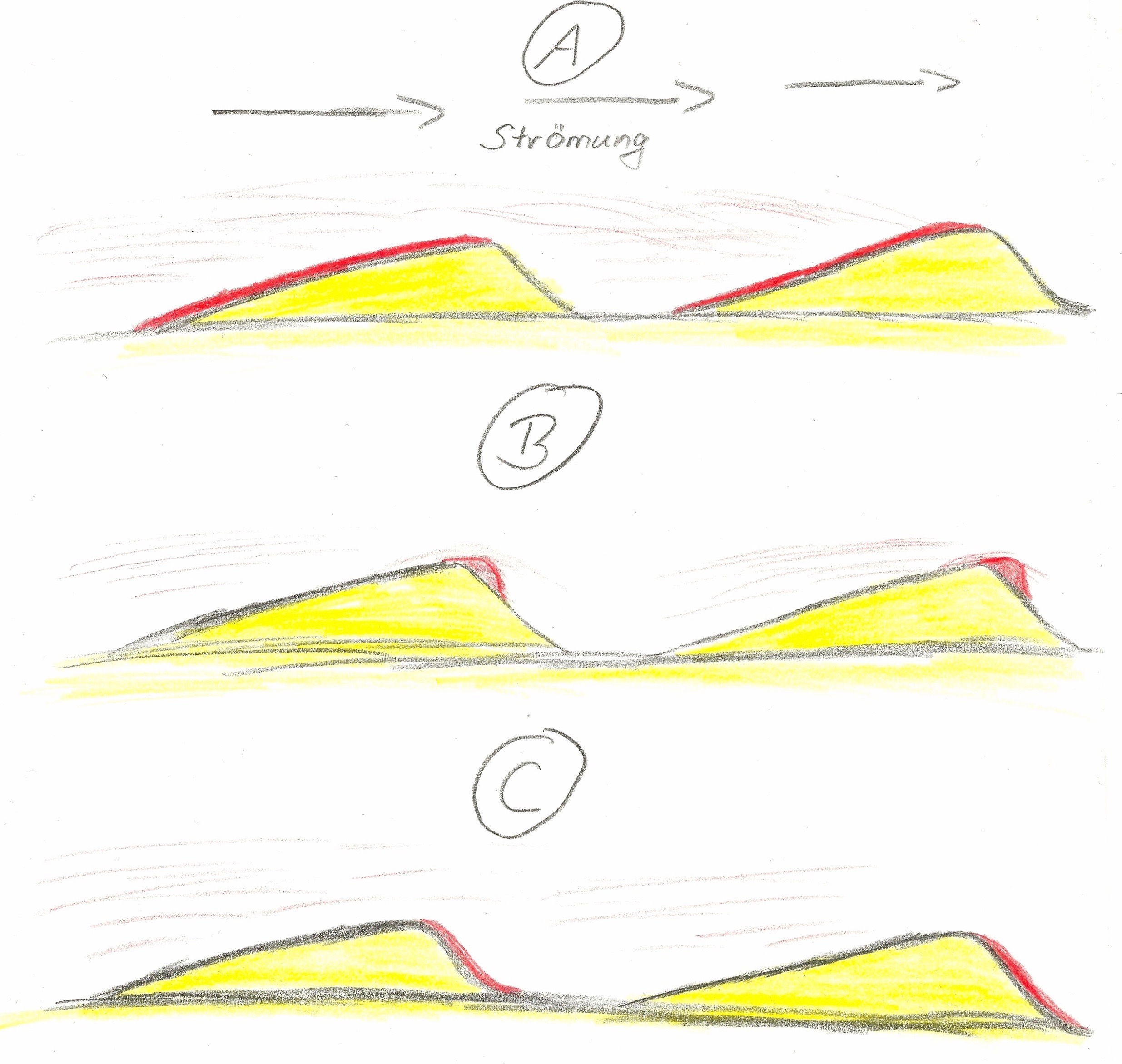 Wie unter (A) in Abbildung 2: Schema Rippel dargestellt, bleiben Sande auf der Luvseite (der Strömung zugewandten Seite) liegen. Die Schräge baut sich auf. Die anhaltende Strömung nimmt von dieser flachen Seite Material mit. Durch Verwirbleungen entstehen an der leeseite der Kuppe eine Anhäufungen (B). Aufgrund der losen Strukturen rutschen diese Anhäufungen an der 30-35° steilen Leeseite ab, verteilen sich und bleiben im Strömungsschatten liegen.