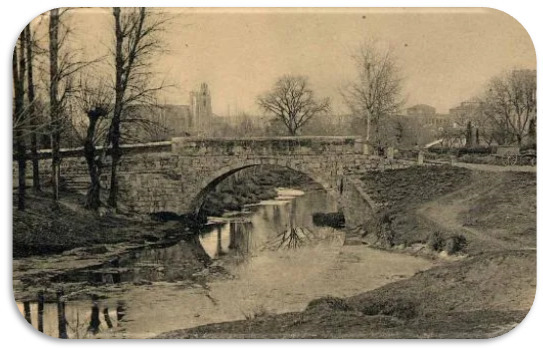 En el camino de Palencia a Villamuriel existe un puente de piedra que antaño estuvo rodeado de huertas y frutales: el puente de Sandoval. Fue reconstruido coincidiendo con la esperada obra de su vecino Puente de Hierro. El proceso de construcción atraía a muchos palentinos, que se acercaban al río para contemplar los métodos tan distintos empleados en uno y en otro.
