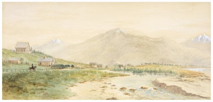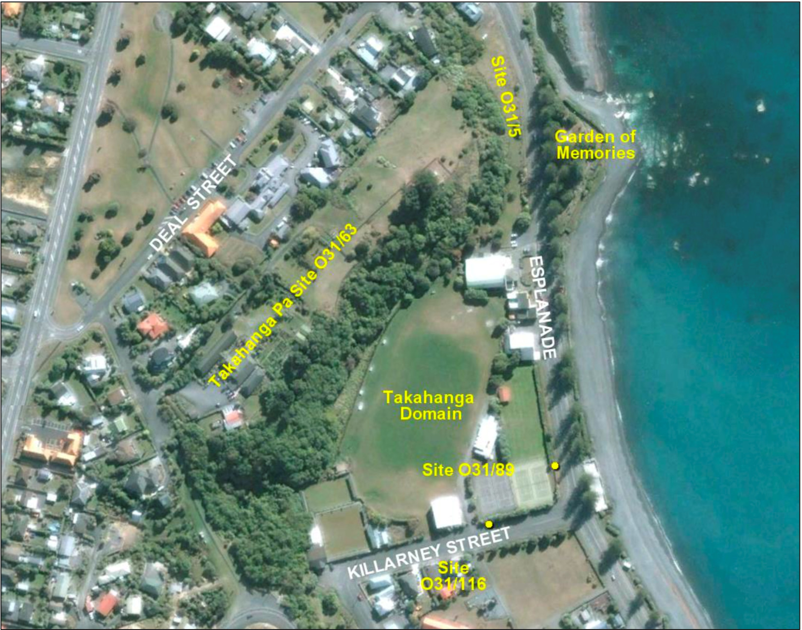 In 1862 the Traveller’s Rest was established on West End Road and soon other small businesses, hotels and whare began to spring up in the area, as well as St Paul’s Presbyterian Church which was built on the hillside below Takahanga Pā (Figure 2). The pā was still occupied at this time but there were very few Ngāti Kuri remaining in the village. In the 1870s they still had waka at their landing site near the mouth of Lyell Creek and they had a flourishing garden on the land reserve at the corner of Killarney Street and the Esplanade.
