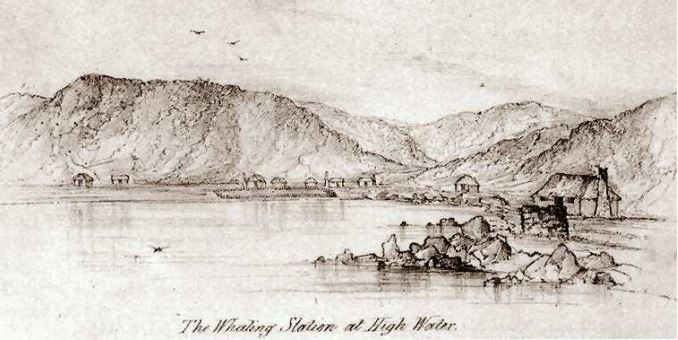 Figure 1: Waiopuka Whaling Station c.1852 looking towards Armers Beach where numerous small huts can be seen (Source: Kaikōura Museum)