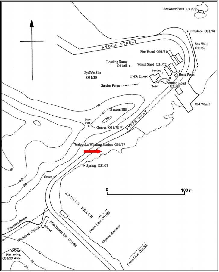 Many small buildings and structures were erected to accommodate the growing settlement. Small huts were seen dotted along Fyffe Quay and over by Fyffe Cove, which is the gap between the hill slopes that are located to the west of Waiopuka Beach (Figure 1). This beach was later renamed Armer’s Beach after Jimmy Harmer one of the local characters who occupied a hut between Fyffe Cove and Waiopuka Beach (Figure 2). Whale bones were abundant in the area and were utilised in many ways including the construction of fences and building foundations.