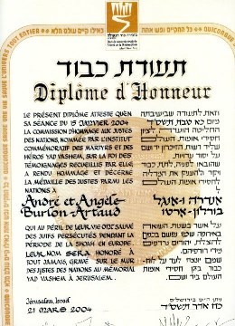 « Pour faire reconnaître une personne comme « Juste » il faut établir un dossier. Il faut deux témoins qui puissent dire que la ou les personnes ont effectivement caché un ou plusieurs enfants pendant l’Occupation. Il a fallu un an pour faire aboutir cette enquête. Et en avril 2005, nous avons organisé une cérémonie. D’ordinaire, la cérémonie a lieu à la mairie de la ville où vivent les Justes, mais les Burlon-Artaud étant décédés, et enterrés à Rives-sur-Fure, la ville natale d’André et non dans la ville où avait eu lieu les événements, il a été décidé de faire la cérémonie à Charavines, commune proche de Rives, puis de nous rendre ensuite sur la tombe d’Angèle et d’André pour un dernier hommage.