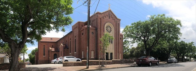 Our Lady of the Rosary church is built of brick in the Romanesque style. It has accommodation for 700 and and cost approximately £10,000 to build. One of the main features is the open timber construction of the roof, which is supplied by heavy framed roof principals of unusual design, the infilling consisting of turned and moulded timbers. The altar is an unusual design, with French, Italian and New South Wales marble being been used in its construction, while the altar steps are of Macclesfield marble, as is also the baptismal font. An outstanding feature is the large white marble crucifix to the right of the sanctuary, which is a memorial to Fr Candler from the parishioners in 1950.