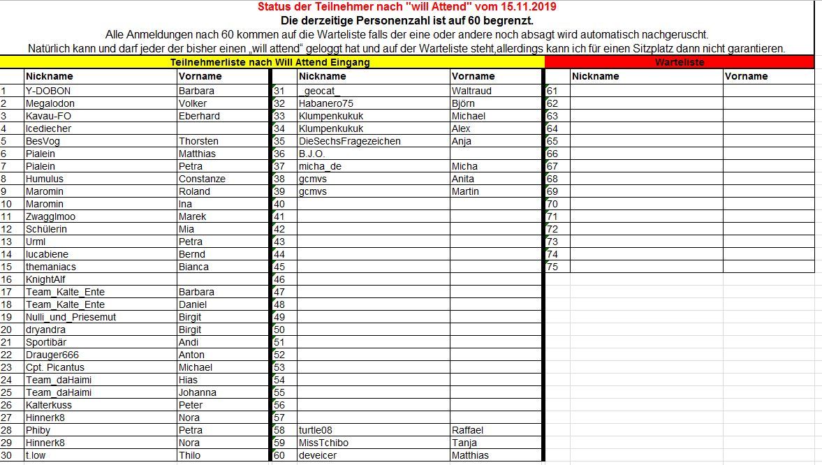 Ich würde dann in der Eventteilnehmerliste sowohl Cacher wir auch Vornamen aufnehmen und unter dem Event veröffentlichen. Ich würde mich freuen, wenn der Vorschlag bei euch ebenfalls auf Anklang finden würde.