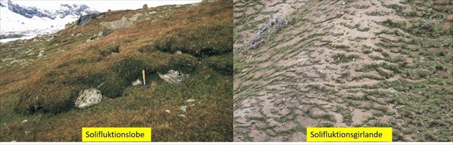 Sedimente im Auftauboden durchmischen sich oder die ganze Erdmasse setzt sich langsam in Bewegung. Ursache ist das Auftauen von Oberbodenschichten über dem Permafrostbereich Dauerfrostböden bei einer gewissen Neigung des Reliefs. Die Auftauschicht (der active layer „aktive Schicht“) des Bodens ist meist wassergesättigt, da der Permafrost im Untergrund ein Versickern des Wassers verhindert. Die Wassersättigung setzt die Reibung im Bodensubstrat herab, was die hangabwärtsgerichtete Fließbewegung ermöglicht. Solifluktion ist der wichtigste Abtragungs- und Transportprozess im Periglazialgebiet. Sie wirkt schon bei sehr flachen Hängen ab ca 2° Neigung. Neben einer Wassersättigung ist die Solifluktion an einen ausreichend hohen Anteil von Feinmaterial (Feinsande, Tone, Schluffe) gebunden. Bewegungsbeträge von ca. 5-10 cm/a können erreicht werden. In Solifluktionsböden finden sich hangparallel eingeregelte Steine und oftmals Pressstrukturen. Je häufiger der Frostwechsel erfolgt, desto ausgeprägter sind die Prozesse. Was dabei herauskommt sind charakteristische Formen und Strukturen im und auf dem Boden. Diese Formen machen sich Wissenschaftler wiederum zu Nutze, um dem „unsichtbaren“ Permafrost auf die Schliche zu kommen. Typische Formen der gebundenen Solifluktion sind Solifluktionsloben (wulstförmige Zungen) und Solifluktionsterrassen, die durch die Behinderung der Massenbewegung durch Vegetation entstehen (Rasenwälzen). Während Schuttloben und Blockzungen aufgrund ansatzweiser Sortierung (Konzentration von Grobmaterial im Stirnbereich) als Übergangsstadium anzusehen sind, sind die Formen geregelter Solifluktion durch Zusammenwirken von Solifluktion und Frostsortierung entstanden (Frostmusterboden).