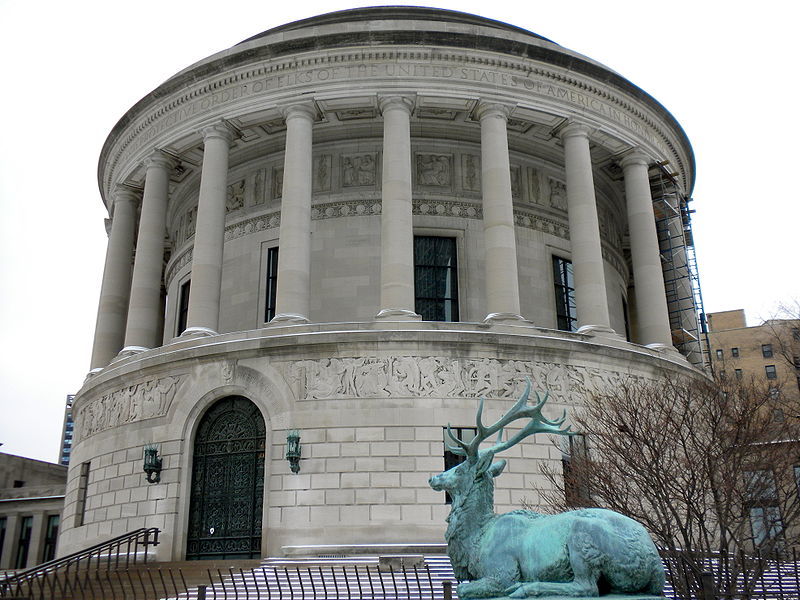 The rotunda displays murals and statues illustrating the Elks’ four cardinal virtues: charity, justice, brotherly love and fidelity. The friezes depict the "Triumphs of War" on one side and "Triumphs of Peace" on the other. The entrance is flanked by large bronze elks.