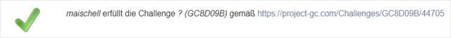 Generell muss bei einem Challenge-Cache neben der Unterschrift im Logbuch eine Aufgabe (Challenge (engl.) = Aufgabe, Herausforderung) erfüllt werden, die mit Geocaching im Zusammenhang steht. Bitte fügt in euren Log einen Nachweis (Text oder Bild vom Checker) an, das ihr diese Aufgabe erfüllt habt.