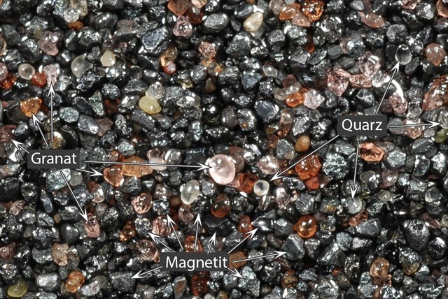 Ein Teil des Sandes besteht aus sogenannten Schwermineralien und eisenhaltigen Körnern, den Magnetiten. Sie stammen ebenfalls aus zerriebenen und verwitterten Gesteinen, unterscheiden sich aber in der Art, in der Färbung und im spezifischen Gewicht. Je höher ihr Anteil ist, desto dunkler erscheint dann der Sand. Erst bei der genauen Betrachtung unter der Lupe werden die unterschiedlichen Korn-Arten sichtbar.