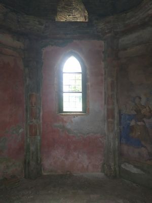Ha forma ottagonale, con una piccola abside rettangolare collegata internamente all’aula centrale mediante un arco a tutto sesto, contrapposta ed in asse con il portone d’ingresso.