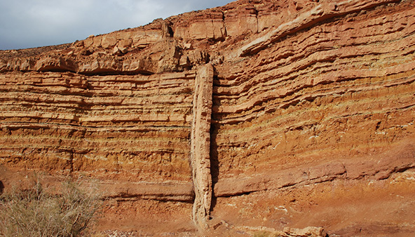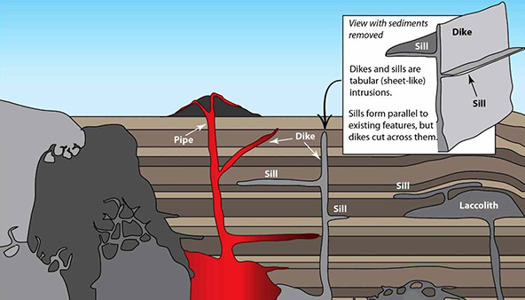In geology, a sill is a tabular sheet intrusion that has intruded between older layers of sedimentary rock, beds of volcanic lava or tuff, or even along the direction of foliation in metamorphic rock. The term sill is synonymous with concordant intrusive sheet. This means that the sill does not cut across preexisting rocks, in contrast to dikes, discordant intrusive sheets which do cut across older rocks. Sills are fed by dikes, except in unusual locations where they form in nearly vertical beds attached directly to a magma source. The rocks must be brittle and fracture to create the planes along which the magma intrudes the parent rock bodies, whether this occurs along preexisting planes between sedimentary or volcanic beds or weakened planes related to foliation in metamorphic rock. These planes or weakened areas allow the intrusion of a thin sheet-like body of magma paralleling the existing bedding planes, concordant fracture zone, or foliations.