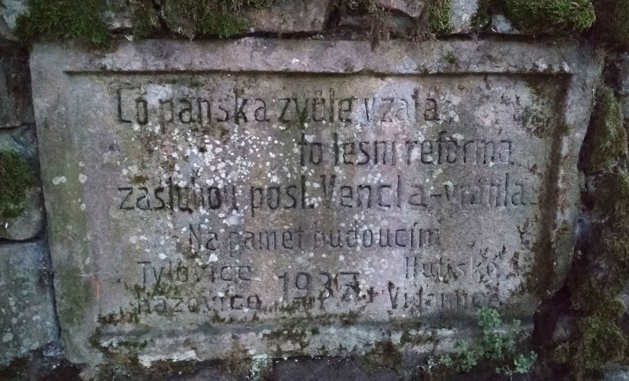 Památník tvoří betonová deska obložená kameny, po levé straně je pak zvláštní betonový kmen, asi 2,5m vysoký. Na pamětní desce je už dost špatně čitelný nápis: „Co panská zvůle vzala, to lesní reforma zásluhou posl. Vencla vrátila. Na paměť budoucím 1937, Tylovice, Hážovice, Hutisko, Vigantice.„ Celý památník je porostlý mechem a docela zanedbaný. O vzniku památníku a vůbec motivaci k jeho zřízení na tomto místě, se v digitálním světě mnoho nalézt nedá, ale budu pátrat dál. Pokud by někdo tušil více, ať to klidně napíše do logu a já rád listing doplním.