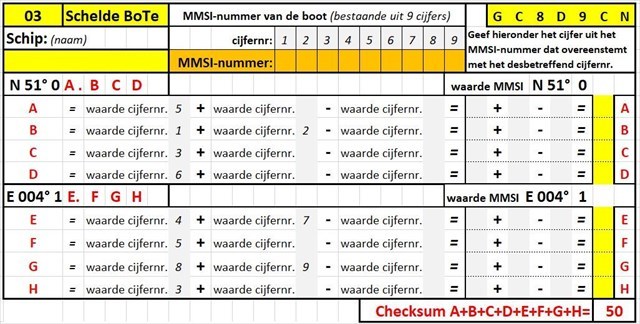- Bereken de waarde van de letters A, B, C, D, E, F, G, H, aan de hand van het gevonden MMSI-nummer.