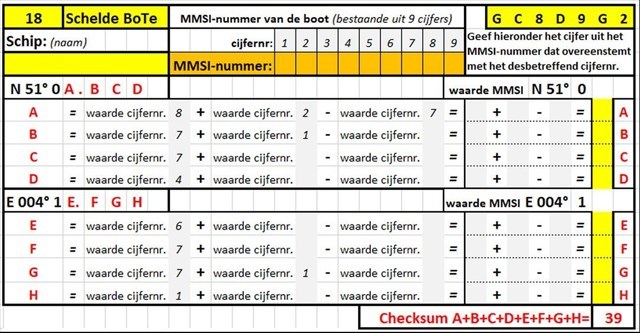 - Bereken de waarde van de letters A, B, C, D, E, F, G, H, aan de hand van het gevonden MMSI-nummer.