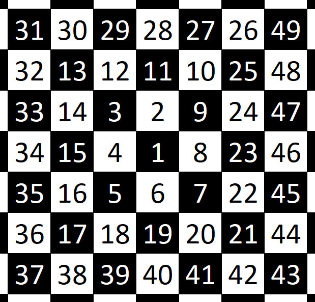 Die Felder sind nummeriert. Wir starten bei der 1 und erhöhen den Index in einer Spirale: