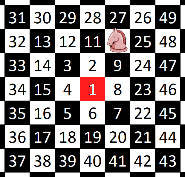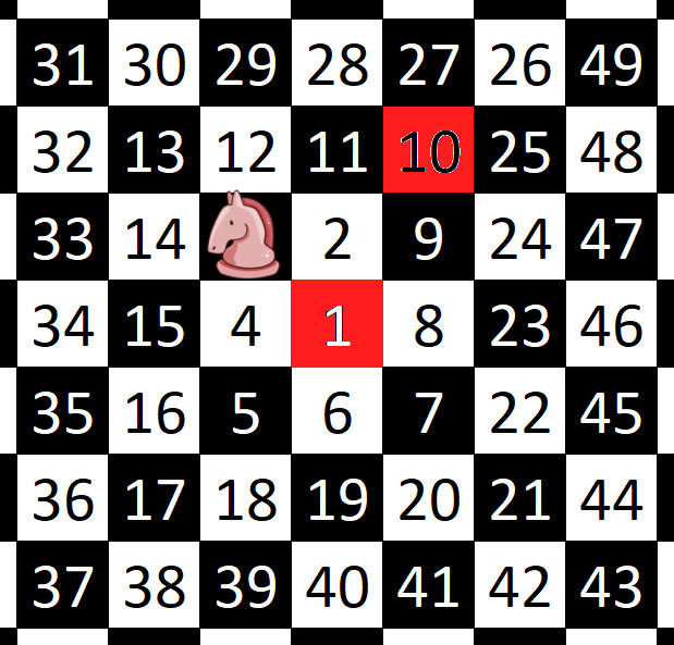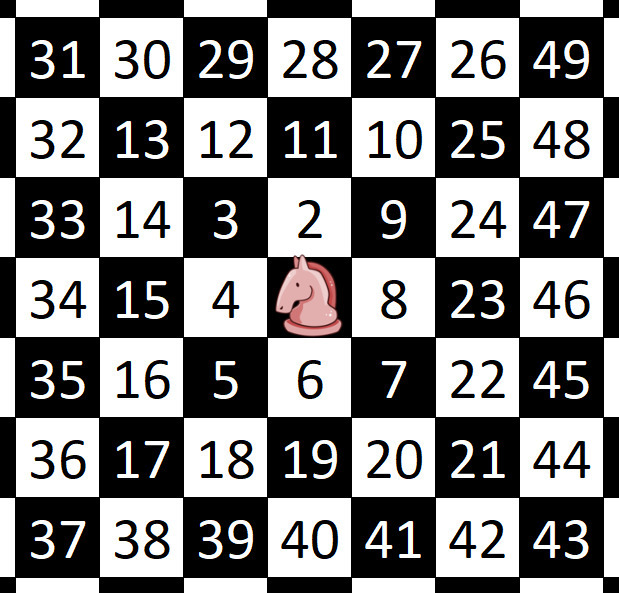 Nach diesen Regeln bewegt ihr euch nun auf dem unendlichen Schachbrett weiter. Doch eines ist bereits klar: So kann das nicht für immer weiter gehen; irgendwann werdet ihr in die Situation geraten, dass alle acht Felder, auf die ihr springen könntet, schon einmal besucht wurden.