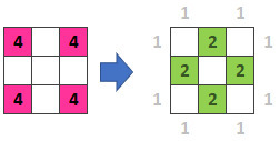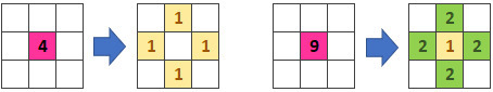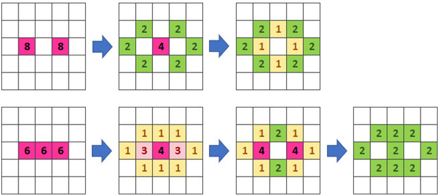 Vasemmanpuoleisessa tapauksessa keskimmäisessä ruudussa on neljä kuulaa, joten ruutu on epävakaa, ja kuulat leviävät. Ruudusta siirtyy yksi kuula jokaiseen viereiseen ruutuun, ja alkuperäiseen ruutuun ei jää yhtään kuulaa. Kaikki ruudut ovat nyt vakaita, eikä leviämistä enää tapahdu