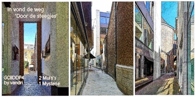 Op de gegeven coördinaten is geen cache te vinden, enkel de ingang van een steegje. De cache zelf is wel te vinden aan de hand van de oplossing van de twee Multi’s ‘Door de steegjes’. In de Multi 'Door de steegjes-1' vind je de waarde van A tot en met F en in de Multi 'Door de steegjes-2' vind je de waarde van G tot en met L.