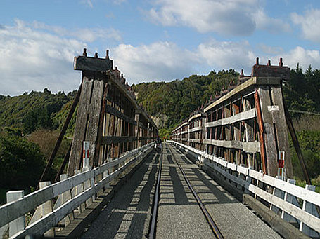 In 2018 a two-lane bridge with dedicated shared walk and cycle path was opened to replace a single-lane wooden construction crossing the river. Up till then the Taramakau River Bridge was a one way bridge where cars and motorcycles shared with trains. A simple give way system worked well for many years until its replacement. The bridge is still used by Kiwi Rail.