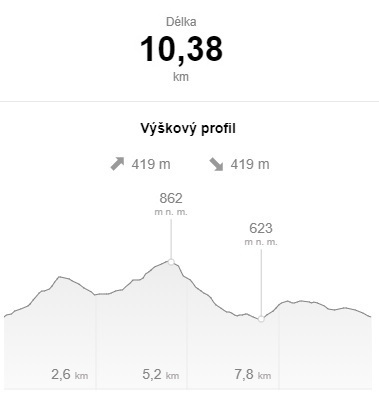 Celková délka: nějakých 11 kilometrů s převýšením přes 400 metrů. Samozřejmě počítejte s tím, že odhad je hrubý a ve skutečnosti se může trasa natáhnout.
