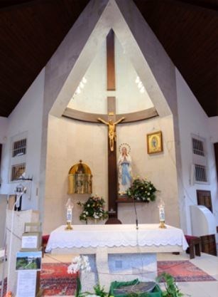 Na stene nad obetným stolom je umietnený veľký jednoduchý drevený kríž. Vpravo od kríža má miesto už spomínaný svätostánok a vľavo socha Panny Márie s obrazom Panny Márie.
