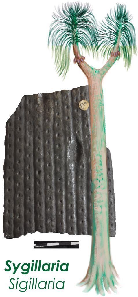 Fig. 1. Karbońskie rośliny - grafiki obrazujące ich wygląd oraz fotografie skamieniałych okazów. Paproć drzewiasta. Rekonstrukcja i fotografia okazu. Źródło: Muzeum Geologiczne PIG-PIB Rys. K. Sabath, Fot. K. Skurczyńska-Garwolińska. Lepidodendron i sygillaria - źródło: Muzeum Geologiczne PIG-PIB, rys. K. Sabath, fot. K. Skurczyńska-Garwolińska. Kalamit - źródło:Wikimedia Commons, rys. Falconaumanni / Muzeum Geologiczne PIG-PIB, fot. K. Skurczyńska-Garwolińska.
