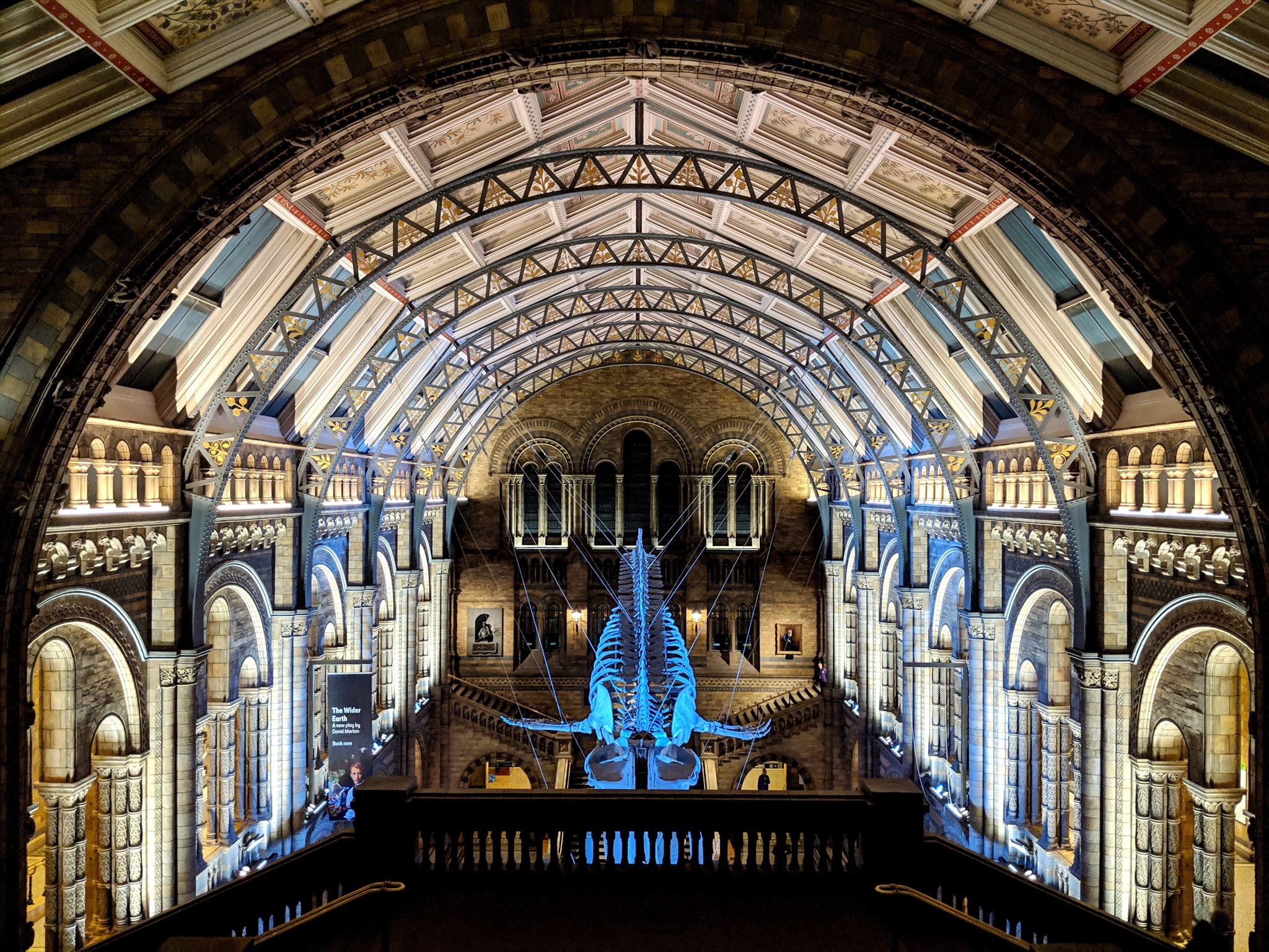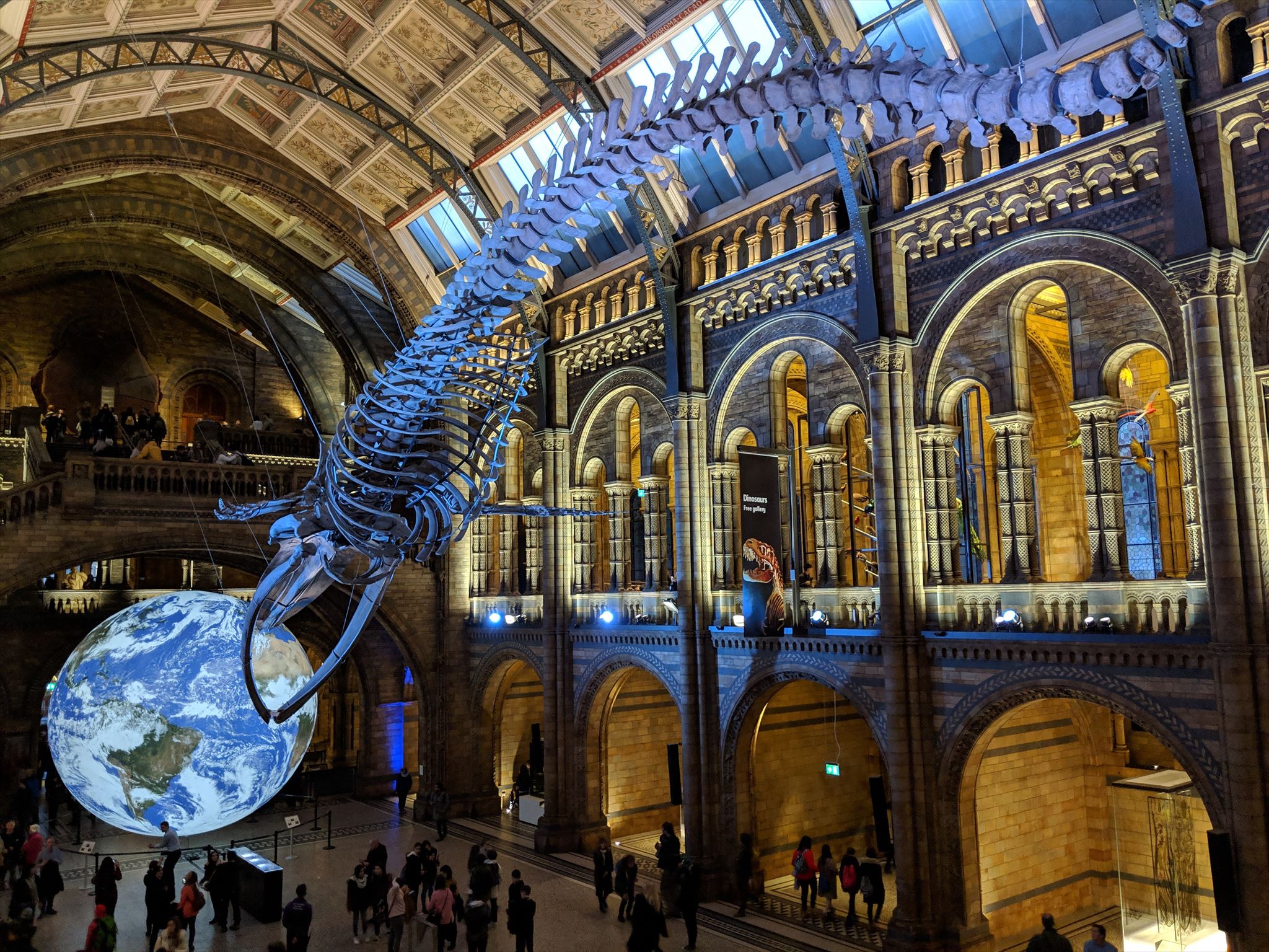 The Museum is a world renowned centre of research specialising in taxonomy, identification and conservation. Many of the collections have great historical as well as scientific value, such as specimens collected by Charles Darwin and during the great scientific expeditions of the 19th and 20th centuries. The museum is particularly famous for its exhibition of dinosaur skeletons and its main vaulted hall was dominated by a large iconic cast of a Diplodocus, nicknamed Dippy for over 100 years. Dippy was replaced in 2017 by a 25 meters long skeleton of a blue whale (dubbed Hope) hanging from the ceiling of the now named Hintze Hall.