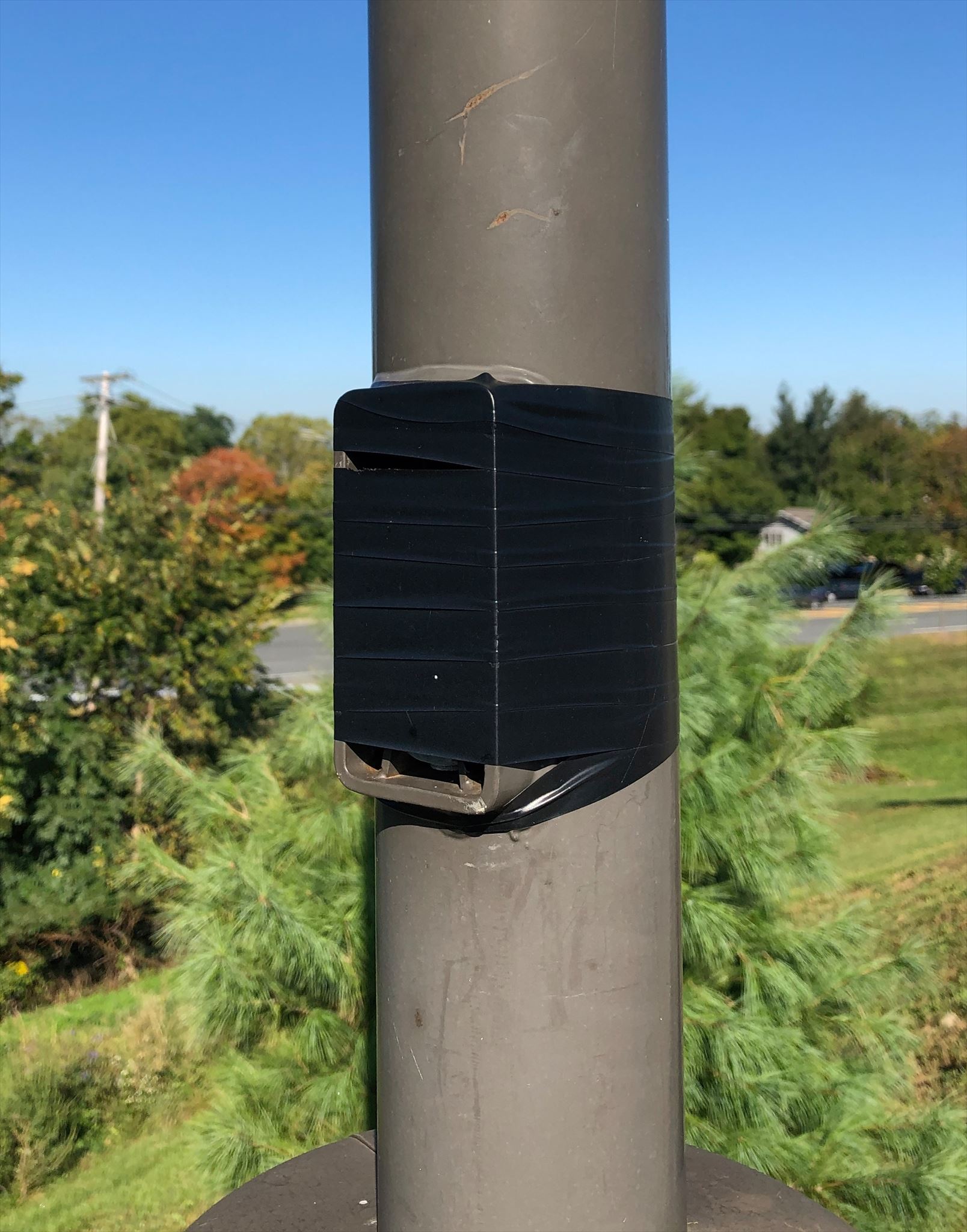 In any case, it looks like they may have cut a few corners here and there. This was one of many poles that had been covered with a tight wrapping of electrical tape. I'm no electrician, but I'm pretty sure this is bad form. But their corner cutting is your chance to earn a smiley! While "admiring" the work, I found a nearby location to place a cache.