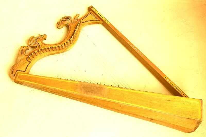 Vaimo toi harpun ja asetti sen pöydälle.