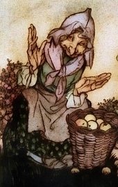 “It’s only a poor old woman,” came a squeaky voice, “selling apples.” Yet it was the evil Queen, disguised as an old woman. “It’s raining out here, my dear,” said her voice through the door. “Please let me in.”