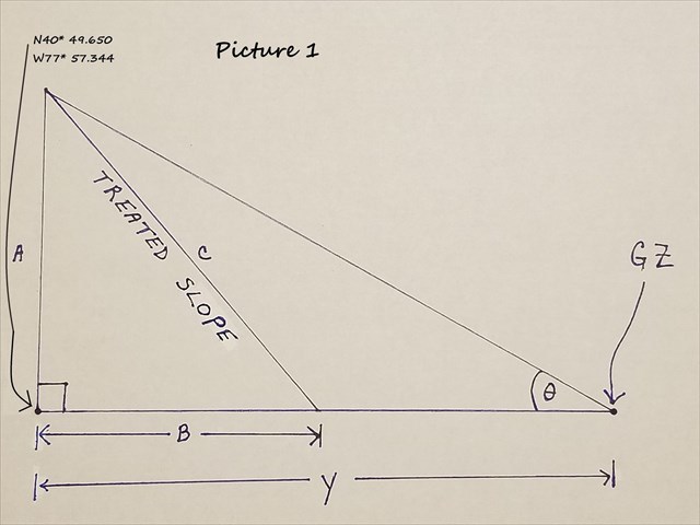 - While at the posted coordinates, use your clinometer, face 245* and determine the angle from where you are to the top of the treatment area. Call this angle Θ (theta).