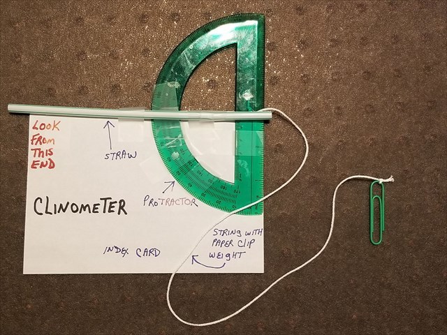 - Build yourself a clinometer. See Clinometer image - tape all parts together. Look through the proper end and the string will cross the protractor at the angle you are trying to determine. You can also search on-line for step by step instructions on how to make/use one.